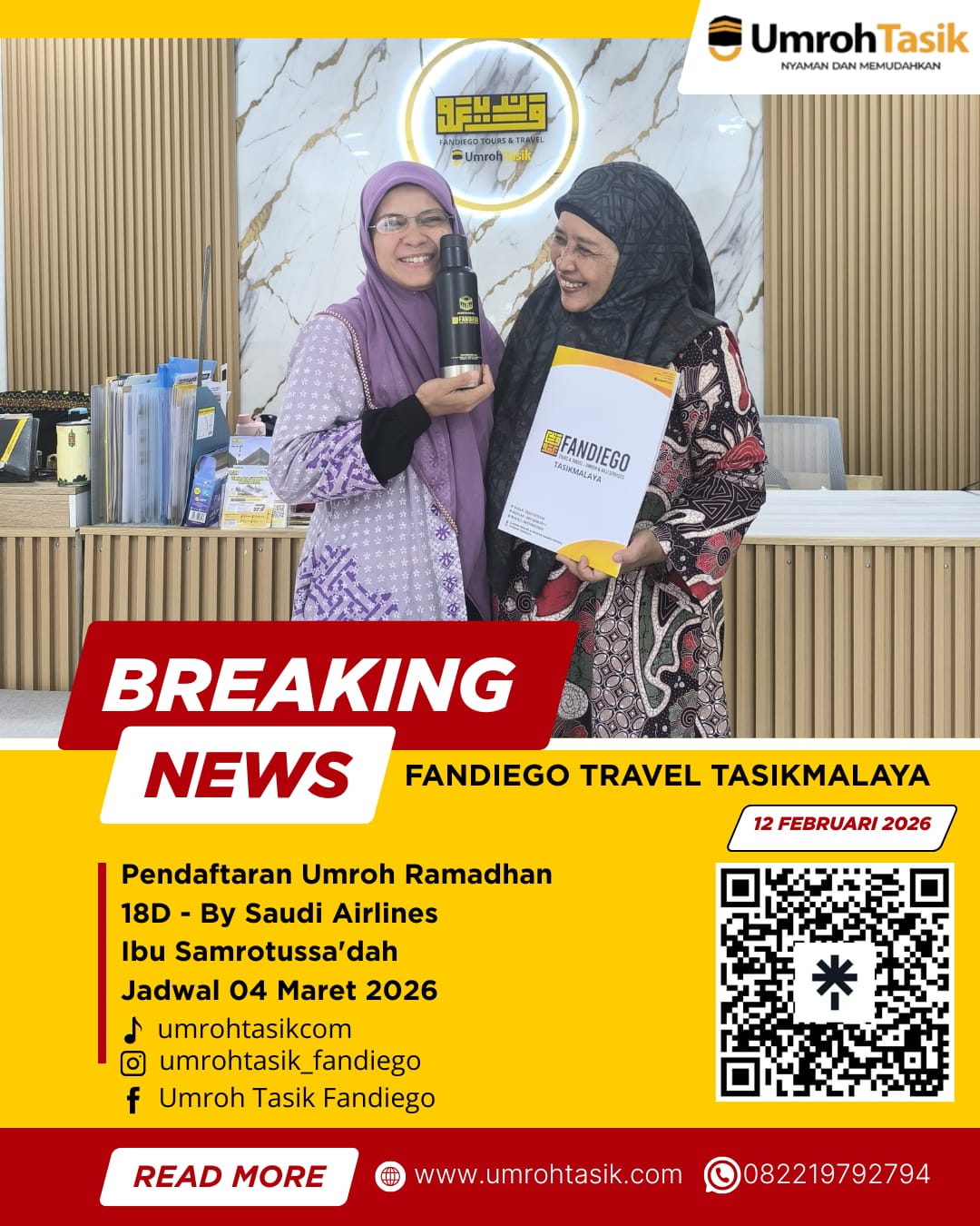 Alhamdulillah, kabar bahagia datang dari Fandiego Travel Tasikmalaya. Pada 12 Februari 2026, telah resmi terdaftar salah satu jamaah atas nama Ibu Samrotussa’dah untuk program Umroh Ramadhan 18 Hari dengan keberangkatan 04 Maret 2026, menggunakan penerbangan langsung bersama Saudi Airlines.