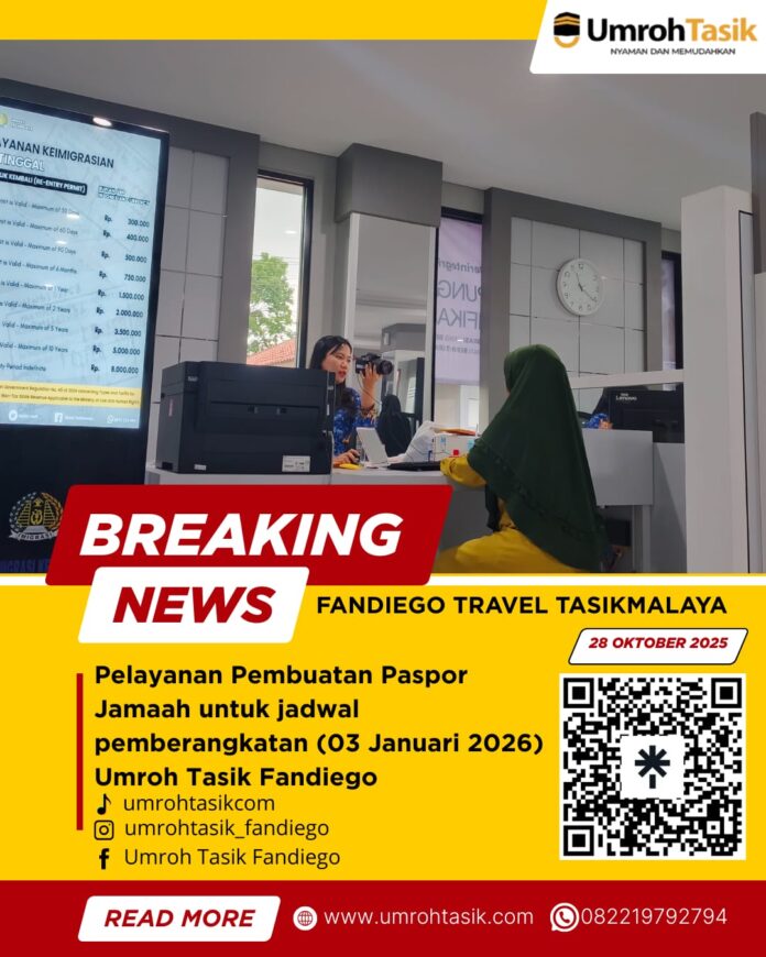 Tasikmalaya, 28 Oktober 2025 – Fandiego Travel Tasikmalaya kembali memberikan pelayanan terbaik bagi calon jamaah umroh yang akan berangkat pada 03 Januari 2026. Melalui program pelayanan pembuatan paspor, Umroh Tasik Fandiego membantu jamaah dalam proses administrasi keberangkatan agar lebih mudah, cepat, dan nyaman.