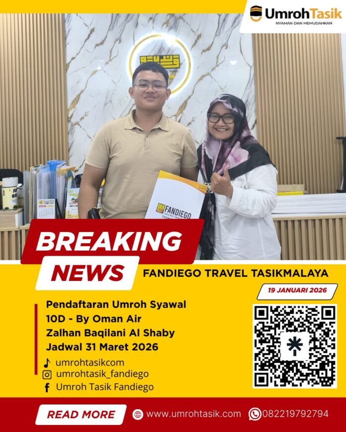 Kabar gembira bagi kaum Muslimin yang tengah mempersiapkan perjalanan ibadah ke Tanah Suci. Fandiego Travel Tasikmalaya secara resmi membuka Pendaftaran Umroh Syawal 2026, dengan jadwal keberangkatan pada 31 Maret 2026.