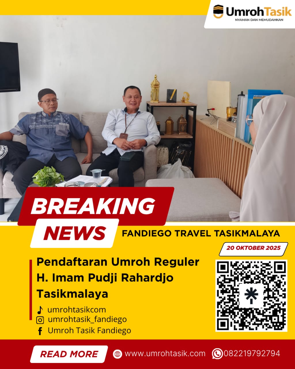 Tasikmalaya, 20 Oktober 2025 – Kabar bahagia datang dari Fandiego Travel Tasikmalaya (Umroh Tasik). Kali ini, H. Imam Pudji Rahardjo resmi mendaftar untuk program Umroh Reguler, sebagai langkah nyata untuk memenuhi panggilan suci menuju Tanah Haram.