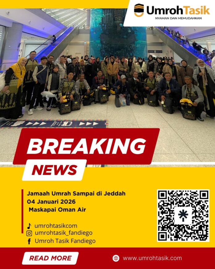 Alhamdulillah, jamaah Umrah Umroh Tasik Fandiego telah tiba dengan selamat di Jeddah pada 04 Januari 2026 menggunakan maskapai Oman Air. Kedatangan jamaah disambut dengan penuh rasa syukur setelah menempuh perjalanan udara yang lancar dan nyaman.