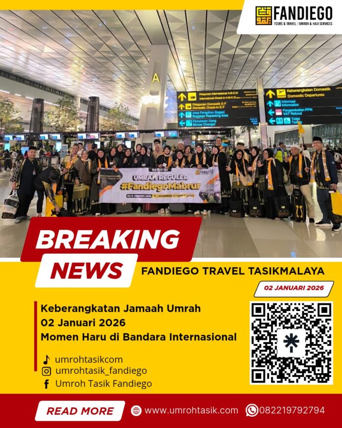 Tasikmalaya — Suasana haru dan penuh doa menyelimuti Bandara Internasional pada 02 Januari 2026, saat rombongan jamaah Umrah Reguler Fandiego Travel Tasikmalaya resmi diberangkatkan menuju Tanah Suci. Keberangkatan ini menjadi momen istimewa bagi para jamaah yang telah lama menantikan panggilan Allah untuk menunaikan ibadah umrah.Dengan mengenakan seragam khas Fandiego Travel, para jamaah tampak kompak dan penuh semangat.