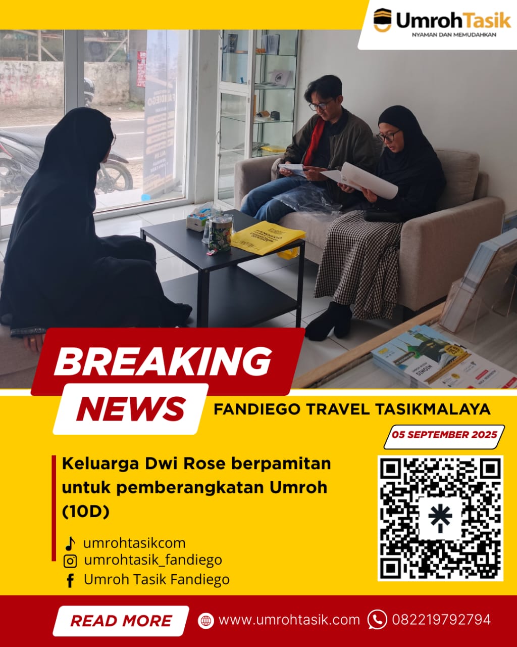 Tasikmalaya, 05 September 2025 – Suasana penuh haru dan kebahagiaan tampak di kantor Umroh Tasik Fandiego saat keluarga Dwi Rose berpamitan untuk keberangkatan ibadah Umroh. Perjalanan suci ini akan ditempuh selama 10 hari (10D), menjadi momen istimewa yang telah lama dinantikan.