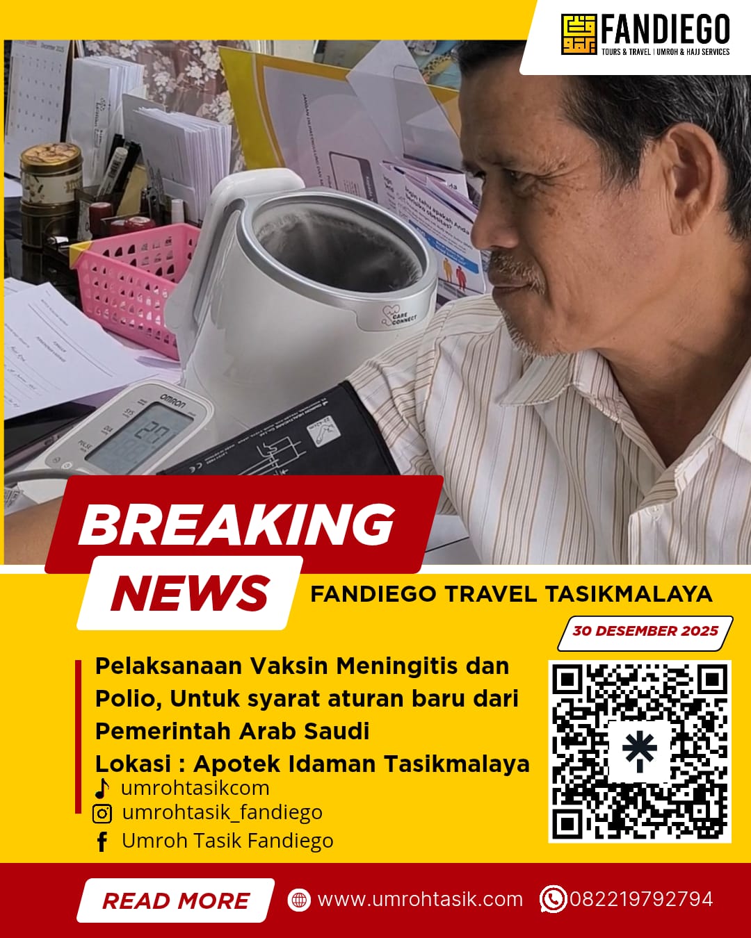 Dalam rangka memenuhi aturan baru dari Pemerintah Arab Saudi, Fandiego Tours & Travel Tasikmalaya melaksanakan vaksinasi Meningitis dan Polio bagi calon jamaah umroh.