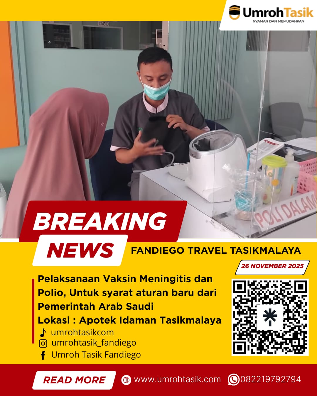 Tasikmalaya, 26 November 2025 – Fandiego Travel Tasikmalaya kembali menginformasikan kepada seluruh jamaah Umroh mengenai pemberlakuan aturan baru dari Pemerintah Arab Saudi terkait syarat kesehatan bagi jamaah yang akan berangkat ke Tanah Suci.
