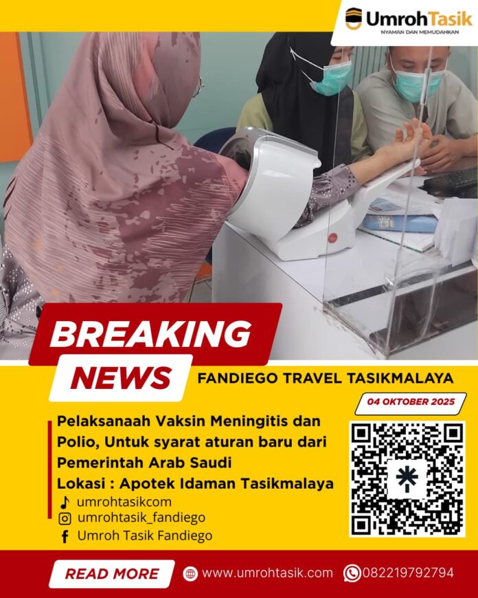 Alhamdulillah, pelaksanaan vaksinasi bagi jamaah Umroh Tasik Fandiego kembali terlaksana dengan lancar. Kali ini, jamaah atas nama Ibu Rahayu Khoeruni’mah dan suami, Bapak Tedi Setiadi, telah melaksanakan vaksin Meningitis dan Polio di Apotek Idaman Tasikmalaya pada tanggal 04 Oktober 2025.