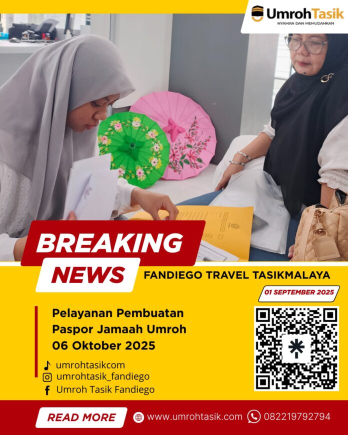 Tasikmalaya, 01 September 2025 – Fandiego Travel Tasikmalaya kembali memberikan pelayanan terbaik bagi para calon jamaah umroh. Kali ini, pelayanan pembuatan paspor telah dilaksanakan khusus untuk jamaah yang akan berangkat menuju Tanah Suci pada 06 Oktober 2025 mendatang.