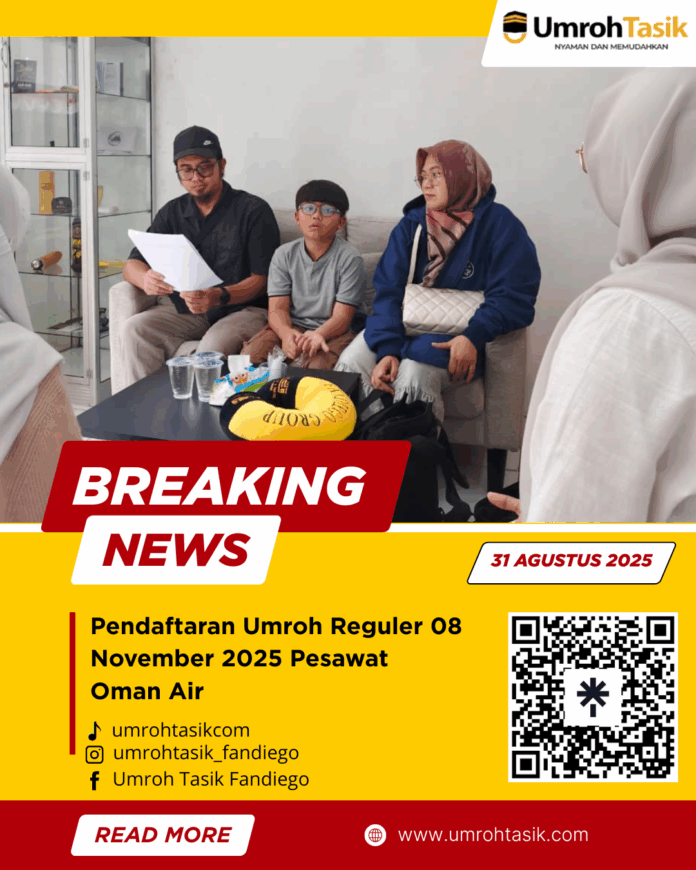 Tasikmalaya, 31 Agustus 2025 – Umroh Tasik kembali membuka kesempatan bagi para calon jamaah untuk menunaikan ibadah ke tanah suci melalui program Umroh Reguler keberangkatan 08 November 2025. Pada gelombang pendaftaran kali ini, jamaah akan diberangkatkan menggunakan maskapai Oman Air yang dikenal dengan layanan nyaman dan fasilitas terbaik untuk perjalanan internasional.
