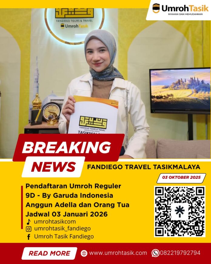 Kabar gembira untuk warga Tasikmalaya dan sekitarnya! Fandiego Travel Tasikmalaya, melalui brand Umroh Tasik, resmi membuka Pendaftaran Umroh Reguler 9 Hari (9D) bersama Maskapai Garuda Indonesia. Program spesial ini akan berangkat pada 03 Januari 2026 dan menghadirkan rombongan istimewa bersama Anggun Adella dan orang tua.