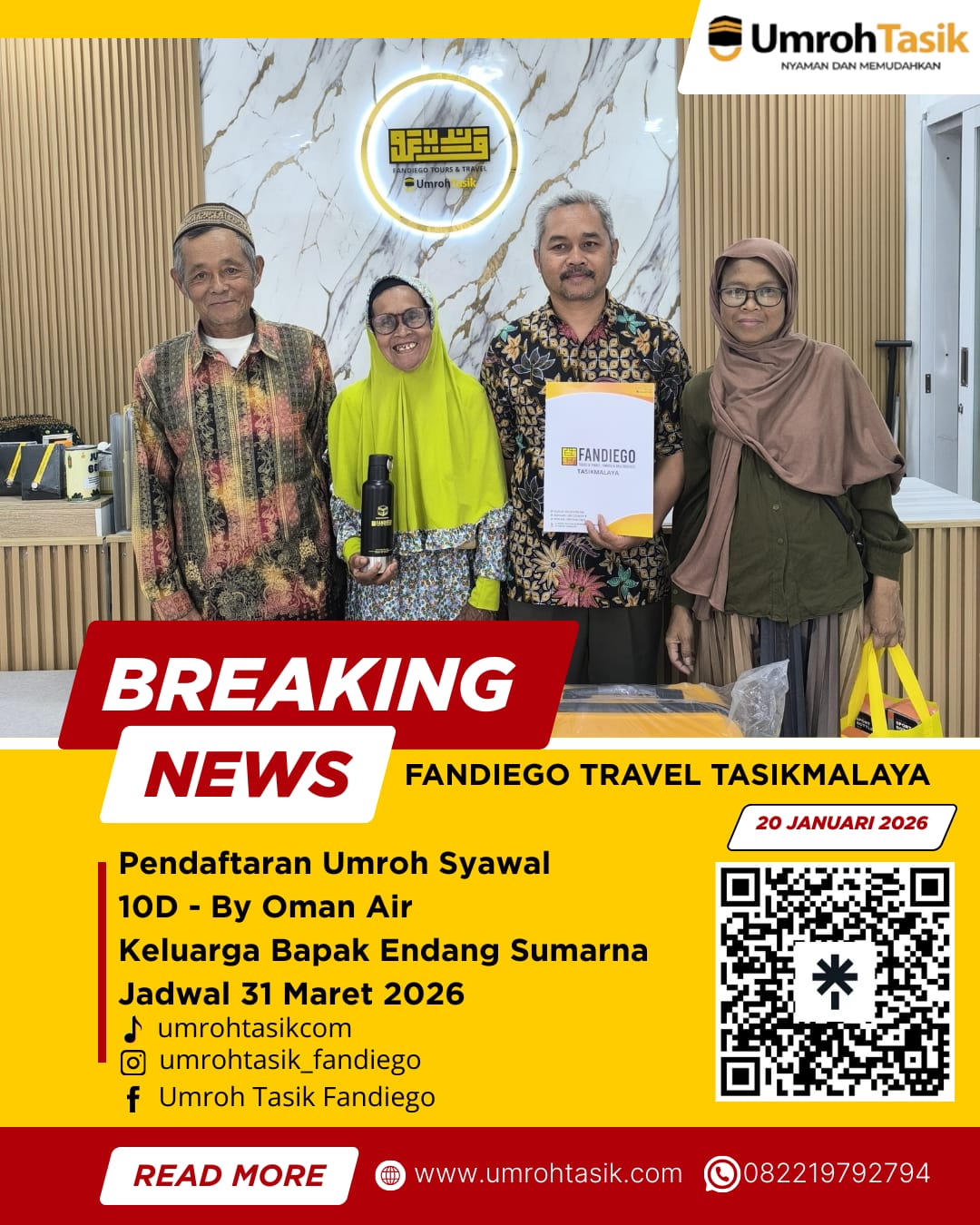 Kepercayaan yang kembali diberikan oleh Keluarga Bapak Endang Sumarna menjadi motivasi bagi Fandiego Travel Tasikmalaya untuk terus meningkatkan kualitas layanan, serta menjadi wasilah bagi lebih banyak kaum muslimin dalam mewujudkan niat suci berkunjung ke Baitullāh.Bagi Bapak/Ibu yang telah memiliki niat untuk menunaikan ibadah umroh, khususnya pada program Umroh Syawal 2026, pendaftaran telah dibuka dan kuota terbatas. Kami mengajak untuk segera melakukan konsultasi dan pendaftaran agar dapat mempersiapkan perjalanan ibadah dengan lebih matang.