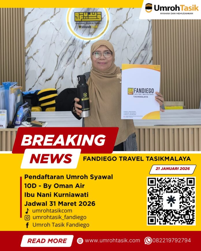 Pada 21 Januari 2026, pendaftaran Umroh Syawal secara simbolis dilakukan oleh Ibu Nani Kurniawati di kantor Fandiego Travel Tasikmalaya. Momen ini menandai dimulainya proses persiapan ibadah umroh untuk jadwal keberangkatan 31 Maret 2026. Dengan pelayanan yang profesional dan berpengalaman, Fandiego Travel kembali menunjukkan komitmennya dalam menghadirkan perjalanan ibadah yang aman, nyaman, dan sesuai syariat.