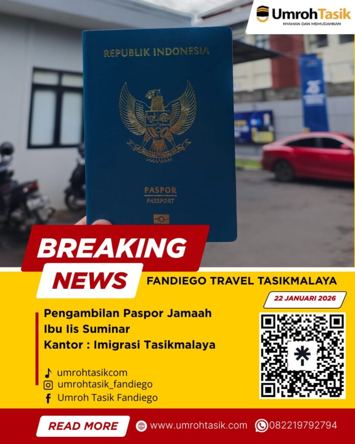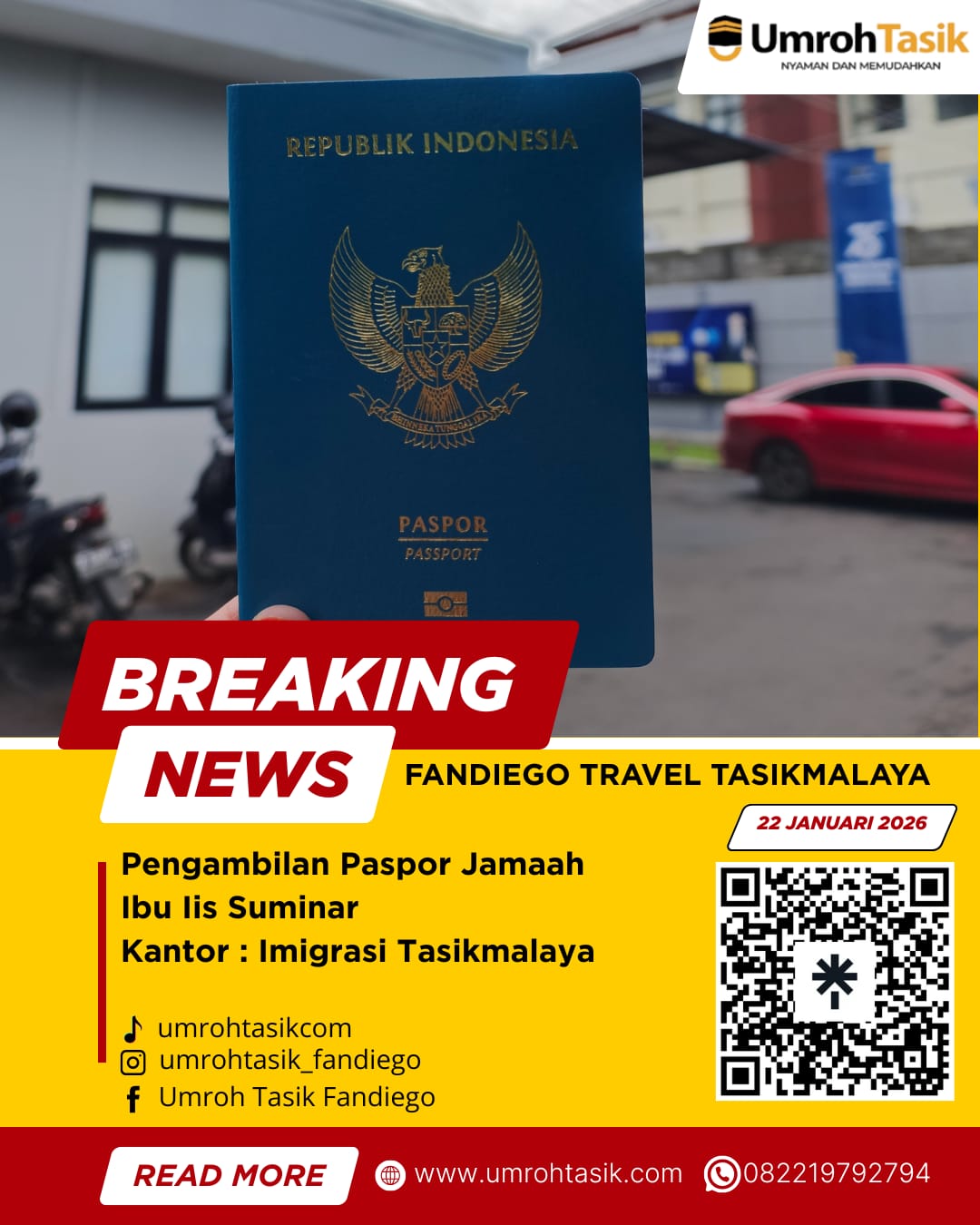 Alhamdulillah, proses pengurusan dokumen perjalanan kembali berjalan dengan lancar. Pada 22 Januari 2026, salah satu jamaah kami, Ibu Lis Suminar, telah melaksanakan pengambilan paspor di Kantor Imigrasi Tasikmalaya. Momen ini menjadi langkah penting dalam rangkaian persiapan ibadah umroh menuju Tanah Suci.