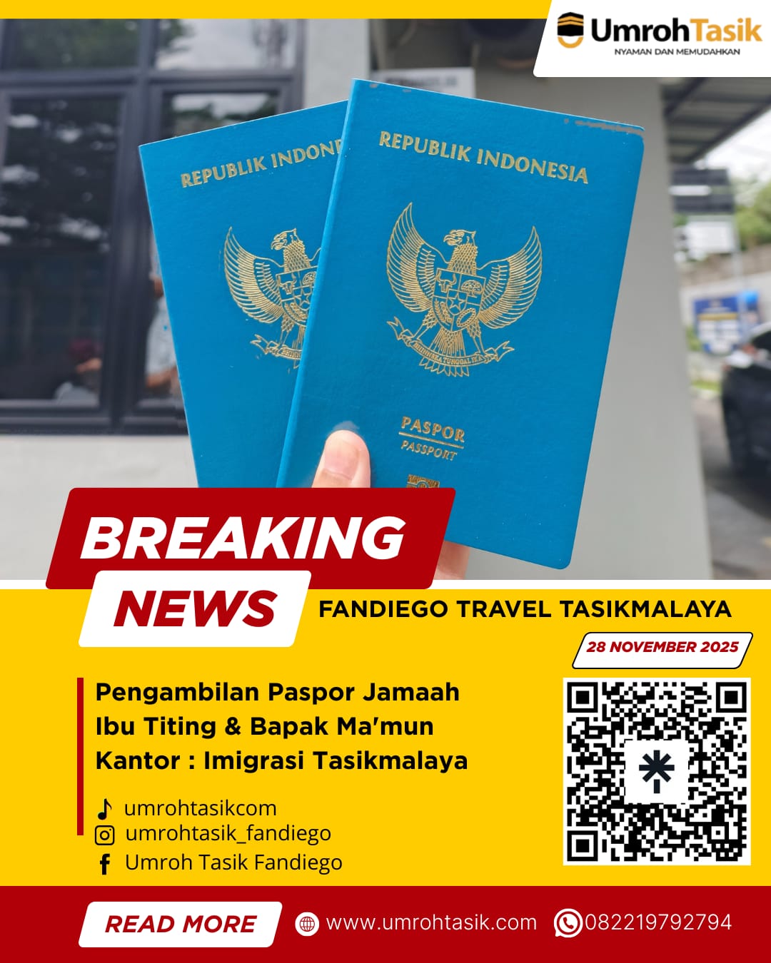 28 November 2025 – Kabar gembira datang dari Fandiego Travel Tasikmalaya! Proses pengurusan paspor untuk jamaah atas nama Ibu Titing dan Bapak Ma’mun telah resmi selesai dan paspor sudah diambil langsung di Kantor Imigrasi Tasikmalaya.