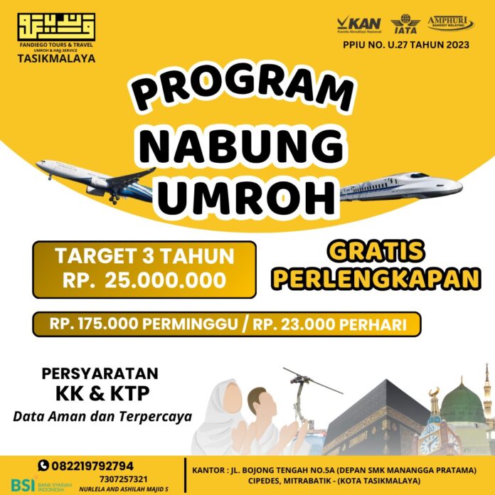 Bagi banyak orang, berangkat umroh adalah salah satu impian terbesar dalam hidup. Namun tidak semua orang bisa langsung membayar biaya perjalanan sekaligus. Untuk menjawab kebutuhan itu, Fandiego Tours & Travel Tasikmalaya menghadirkan Program Nabung Umroh, sebuah cara ringan dan terencana untuk mewujudkan perjalanan ibadah ke Tanah Suci.